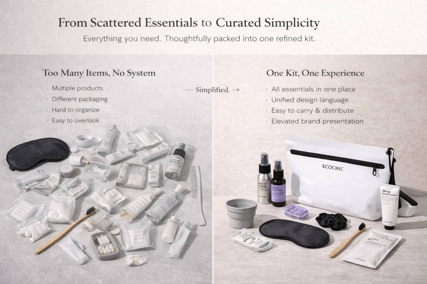 Our Solution: We handle everything for you — from concept to final delivery, providing fully customized travel kits that meet your brand standards and delight your customers.
